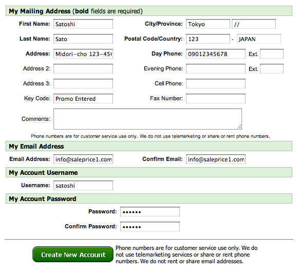 ちなみに「Create New Account」の横にある英文には、「電話番号はカスタマーサービス以外は使用しません。またEメールアドレスを不正使用しません」というような内容です。